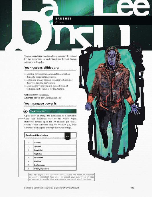 Stillfleet is a politically charged TTRPG set far into the superfuture. Using the unique, highly flexible Grit System, players take on the role of voidminers—salvagers working for the venal Worshipful Company of Stillfleeters (the Co.) who explore ruined spacecraft and earth-like planets that have been cut off from Terra for centuries. The Co.’s headquarters, the alien space station nicknamed Spindle, brims with timespace gates called stiffworks—and with the vile secrets of the Co.’s directors…