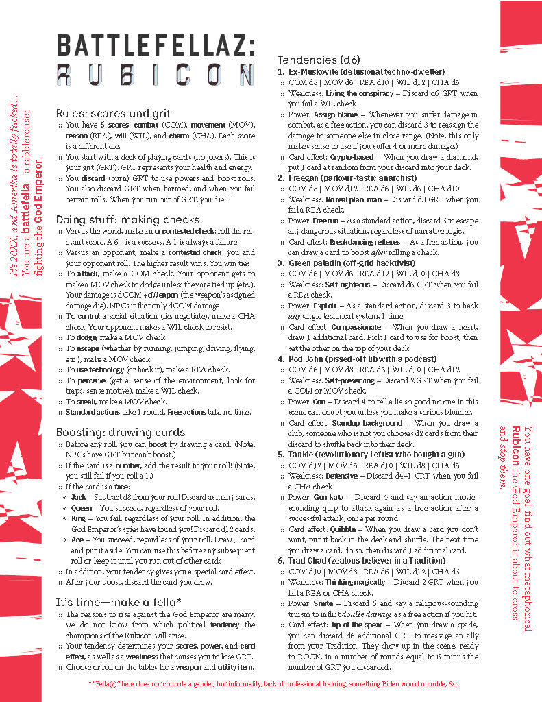 Wythe Marschall (creator of Stillfleet, co-creator of Blister Critters) never made a one-page game before. This year, he said he'd try. The idea: a distillation of online Leftist discourse about the near-future of U.S. politics, summarized in a single word that he thought he heard Felix on Chapo Trap House mumble, imitating Biden: "Battlefellaz…"
