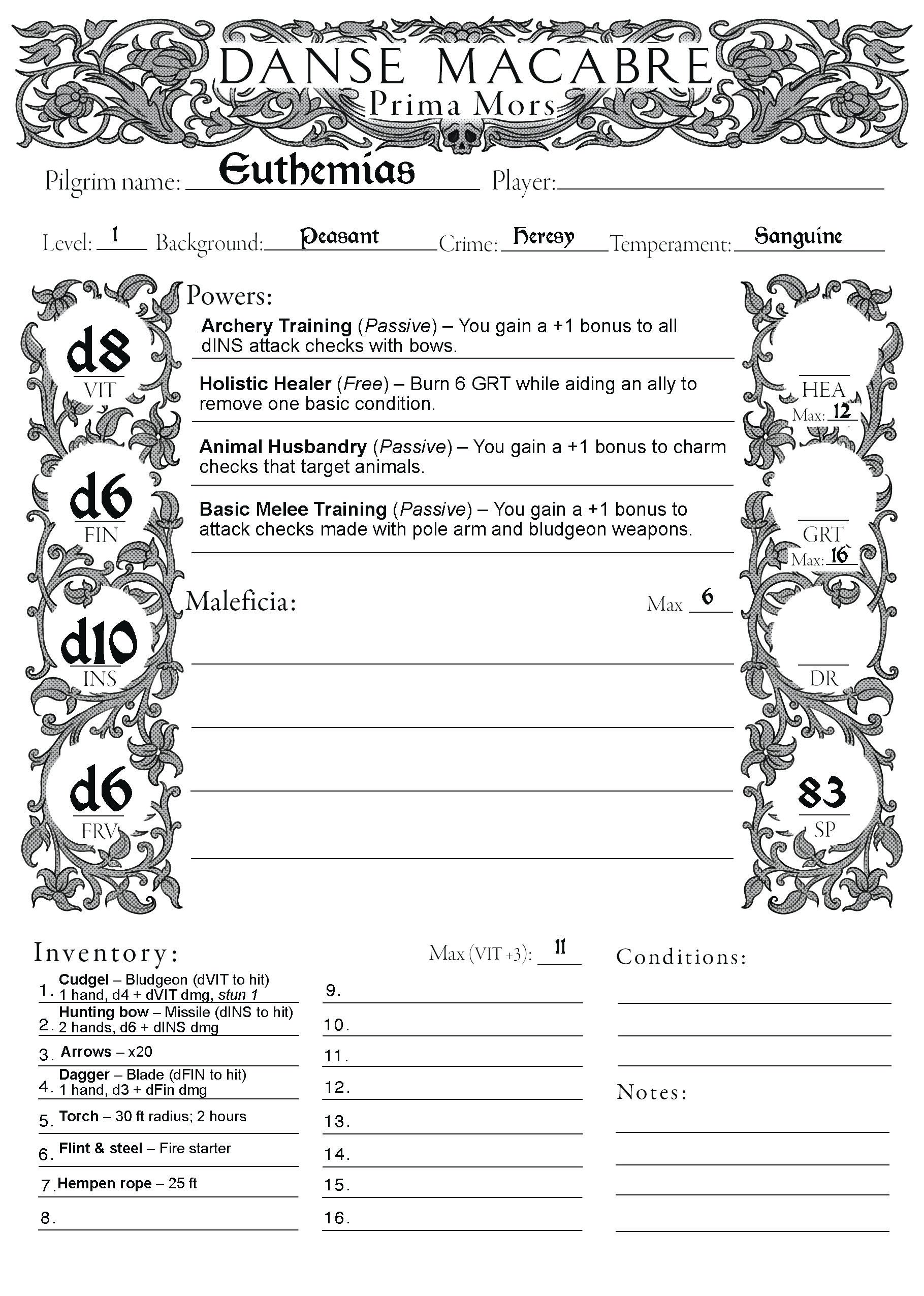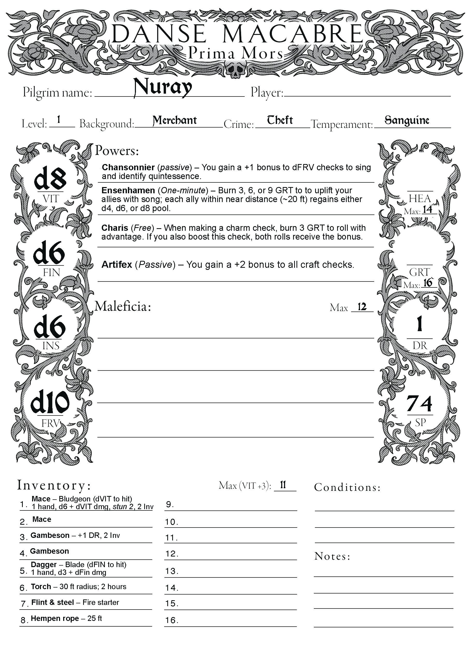 Danse Macabre Character Sheet and Pregens