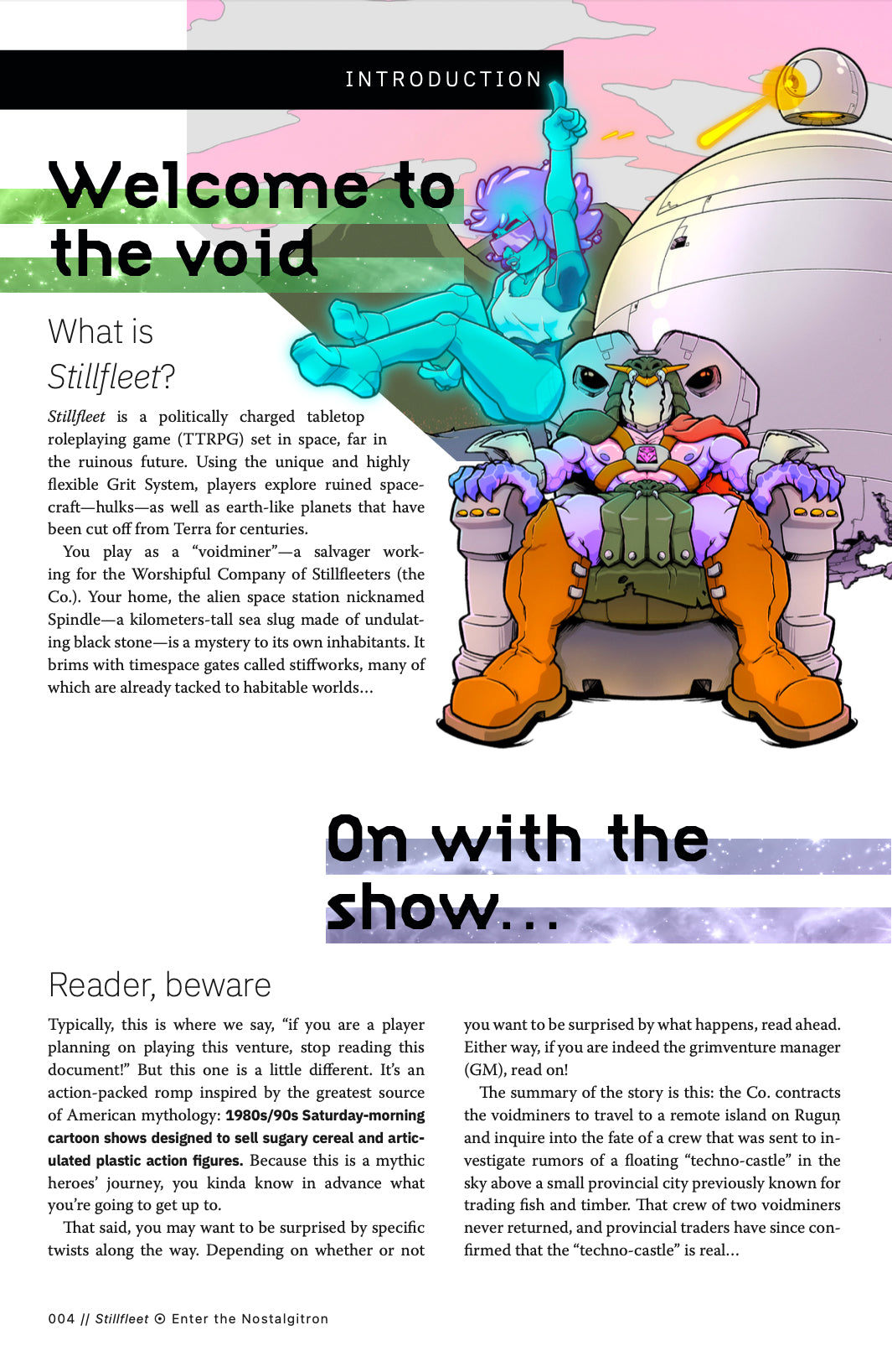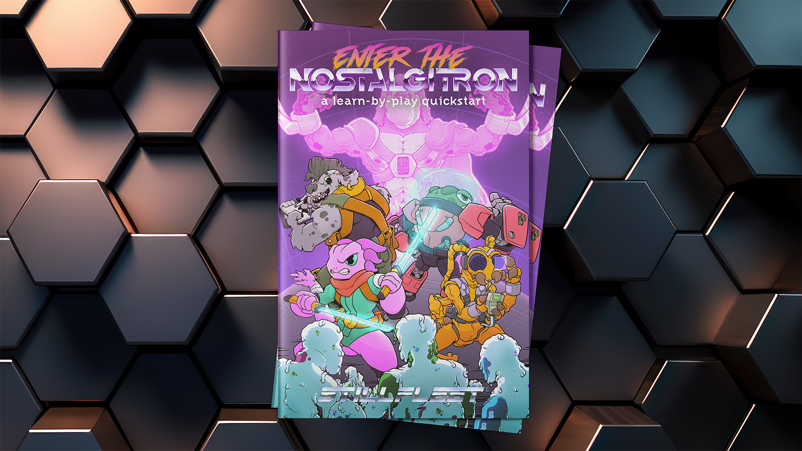 Inspired by the single greatest source of American mythology—1980s/90s Saturday-morning cartoon shows designed to sell sugary cereal and articulated plastic action figures—Enter the Nostalgitron is a fully playable quickstart for Stillfleet, lovingly illustrated by Michael J. Cohen (Arkangel Wulf Design and Illustration).