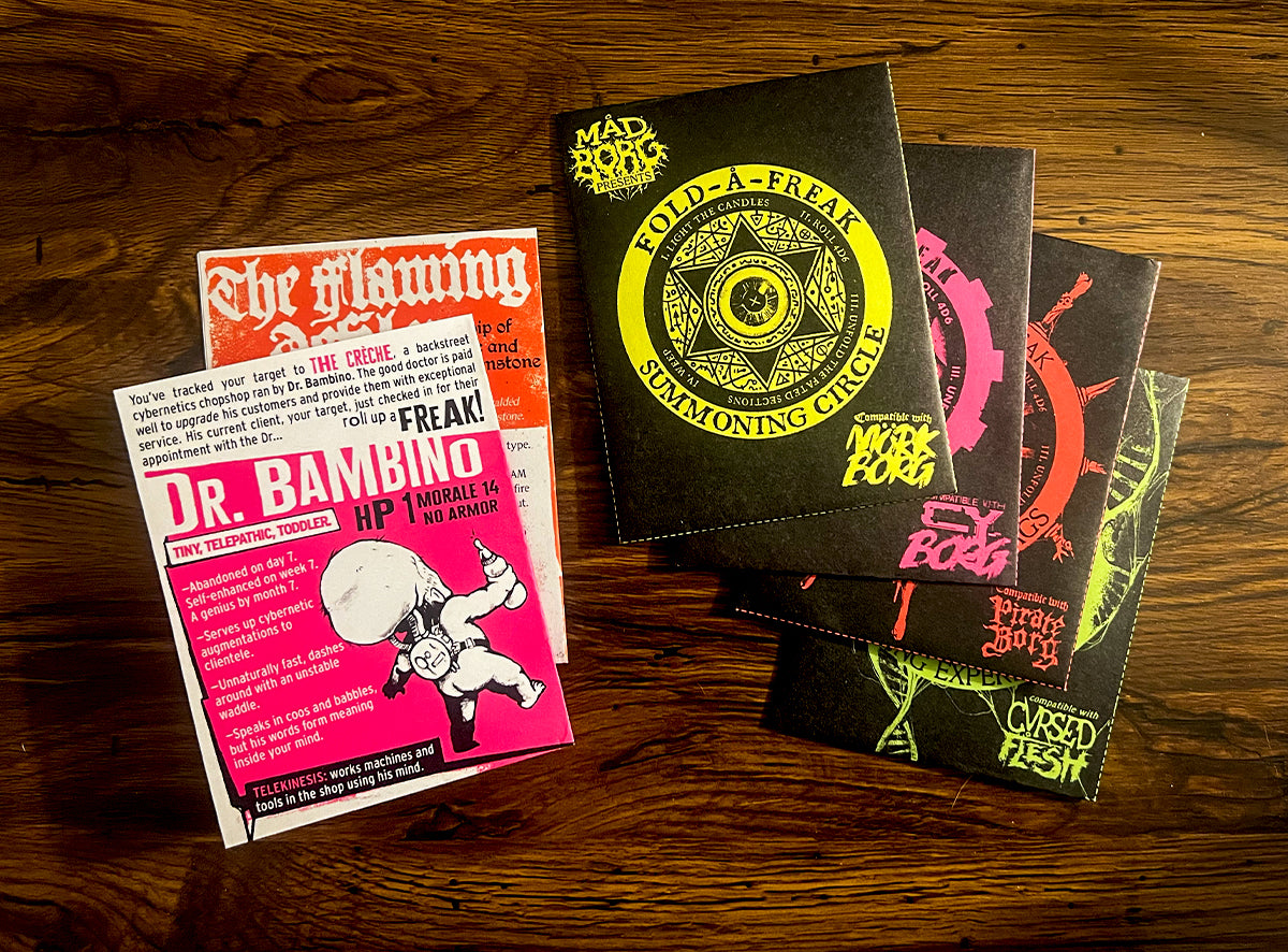 With 4 body parts and 6 options for each, there are 1296 unique freaks per pamphlet! With a pamphlet for MÖRK BORG, CY_BORG, Pirate Borg, and CVRSED Flesh, we’ve designed 4 Fold-Å-Freaks to be brought into your current BORG of choice with ease.