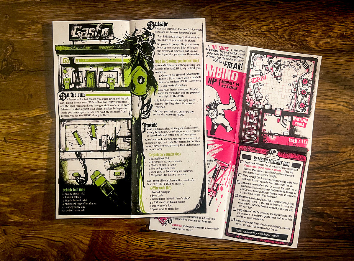 Also included are 2 Dynamic Encounter Pamphlets featuring a small encounter for each game. The pamphlets showcase small locations, weapons to wield against the freaks, environmental hazards to make the nightmare even worse, and simple story hooks that help introduce freaks to players.