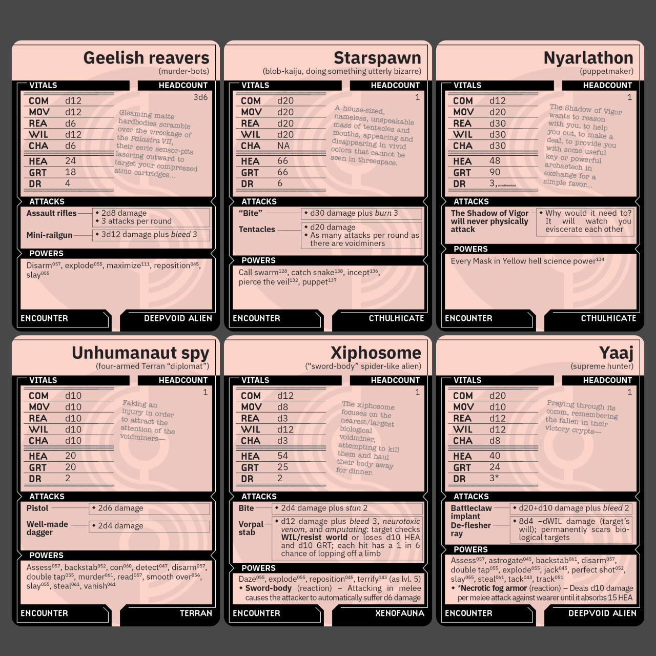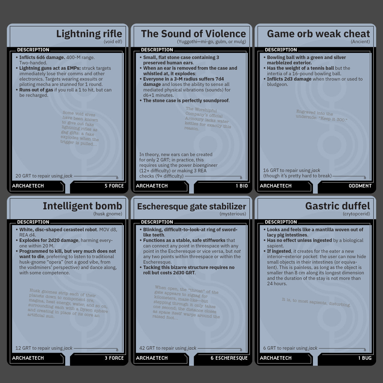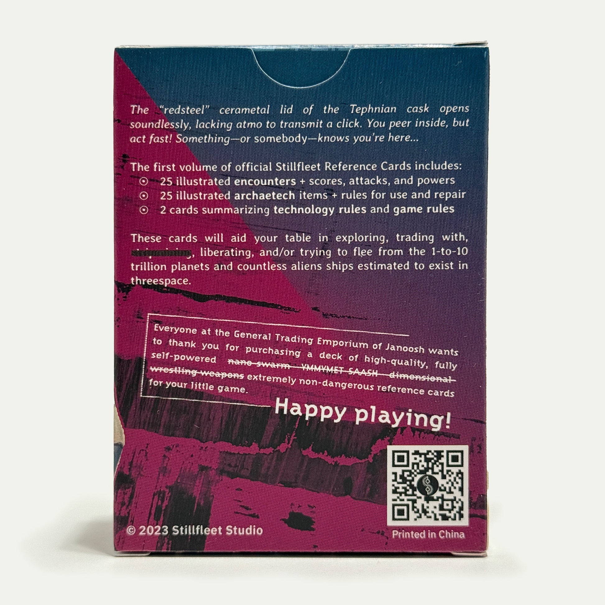To help GMs and players make the most out of Stillfleet games, we’ve printed a deck of cards to help illustrate common game concepts—strange items and all-too-familiar aliens—and drive those everybody-leans-in moments of discovery at the table. The cards make great hand-outs for players, new and veteran.