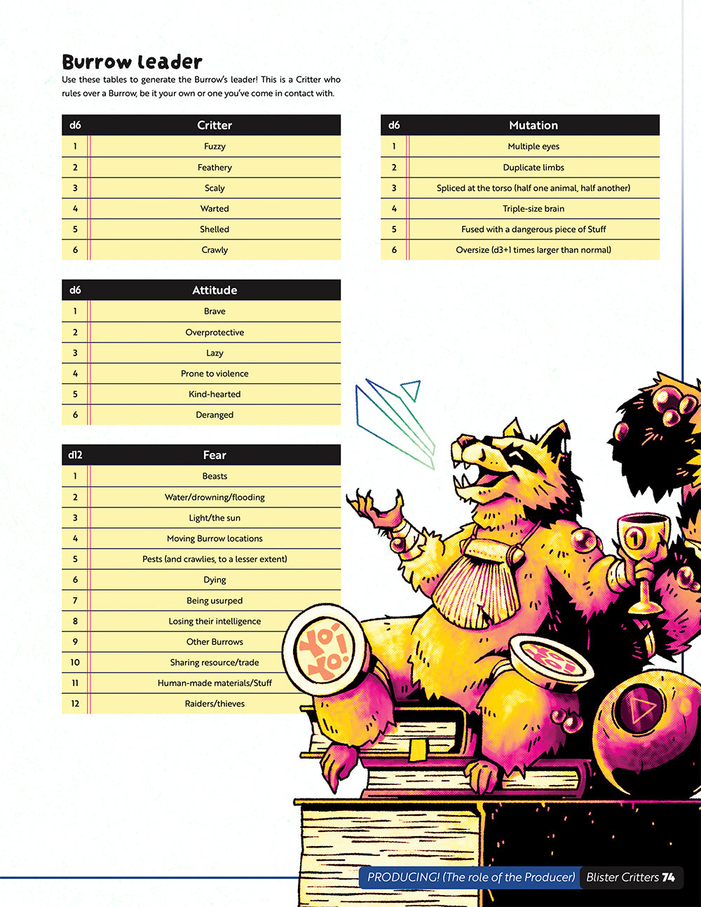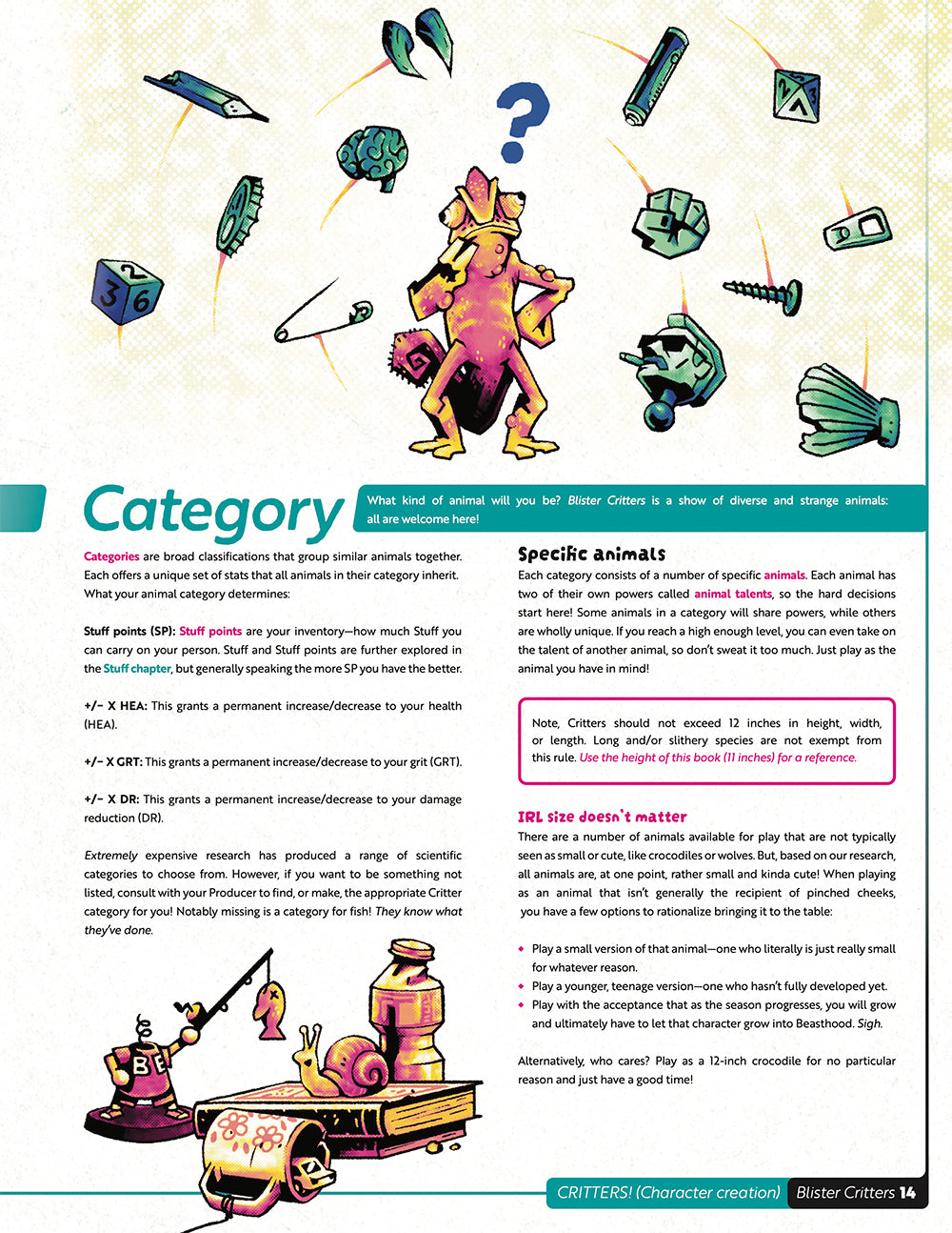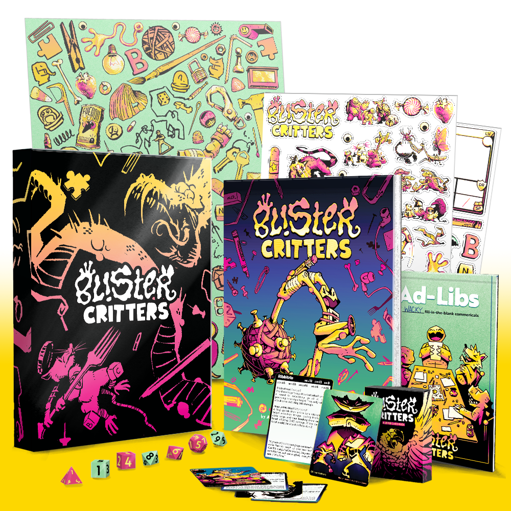Using the innovative Grit System, Blister Critters drops players into a bizarre posthuman world of Blisters (mutations), physics-bending Nonsense powers, dangerous feral Beasts, and a near-infinite amount of human Stuff. The boxed set includes a set of thoughtfully designed, nostalgia-washed tools to help players and Producers make the most of each episode:
