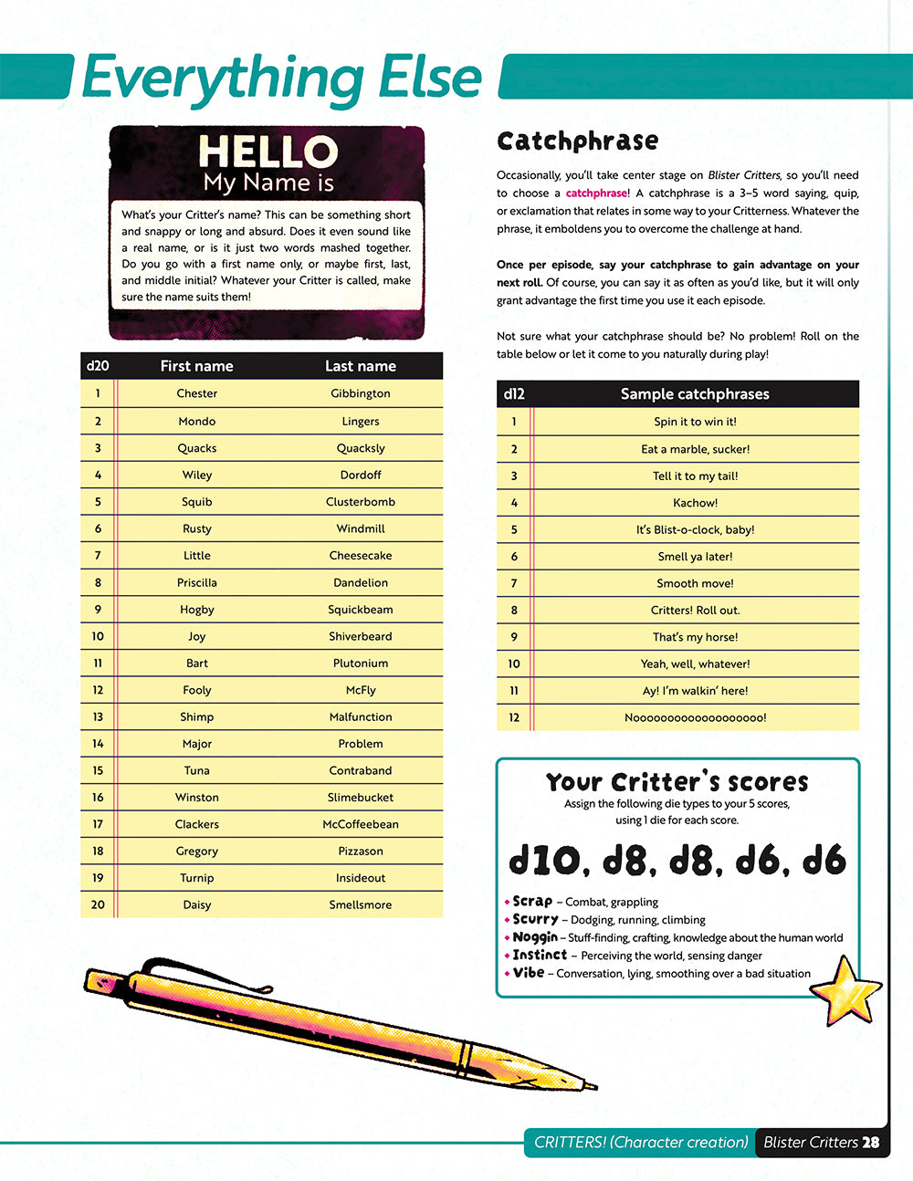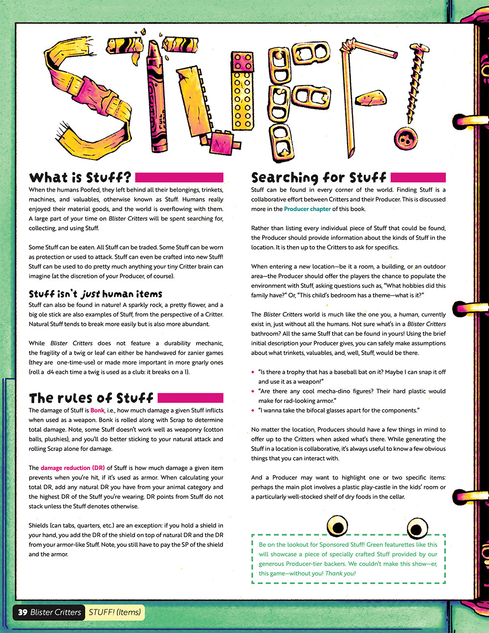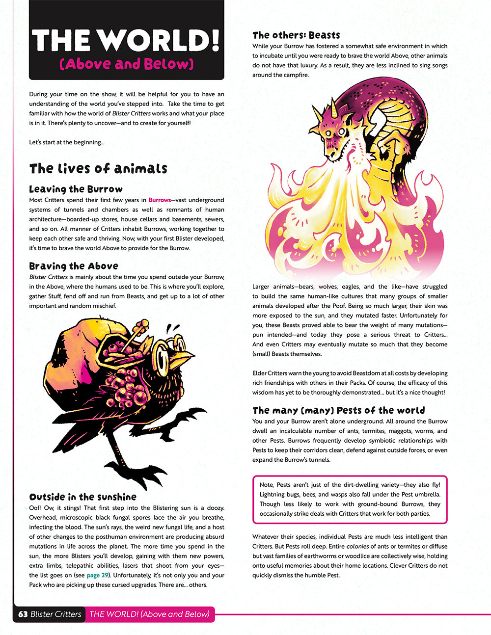 - The Blister Critters Rulebook! 100 pages of mayhem, including player-empowering rules for exploring odd and eerily familiar locations in a vast, cruel suburbia