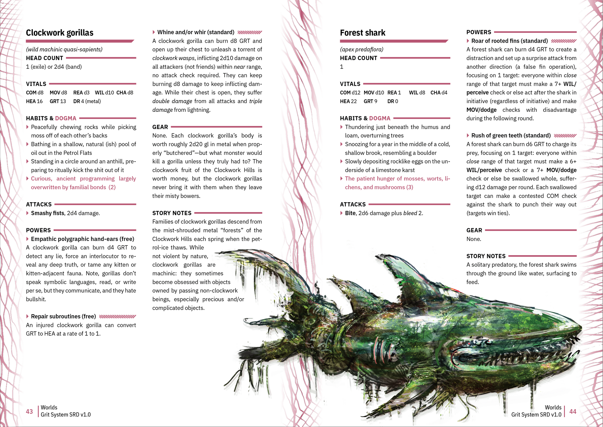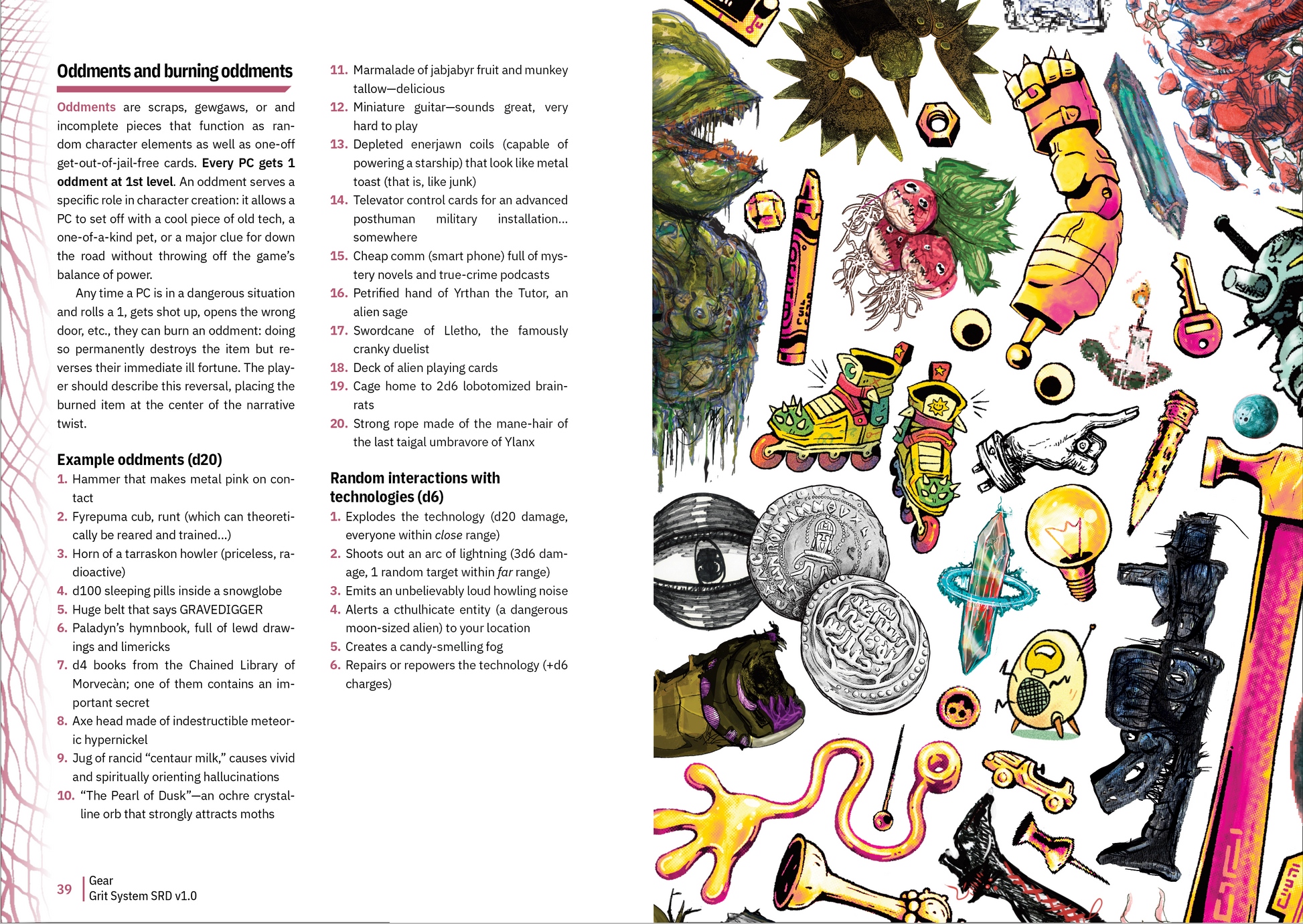 This 52-page book functions as both a system reference document (SRD) for the Grit System as well as a standalone science-fantasy game, complete with different playable classes, species, Weird powers (spells), rules for level gain and advanced powers, tables of gear and treasures, and full encounters ranging from clockwork gorillas to cultists to warmachines.