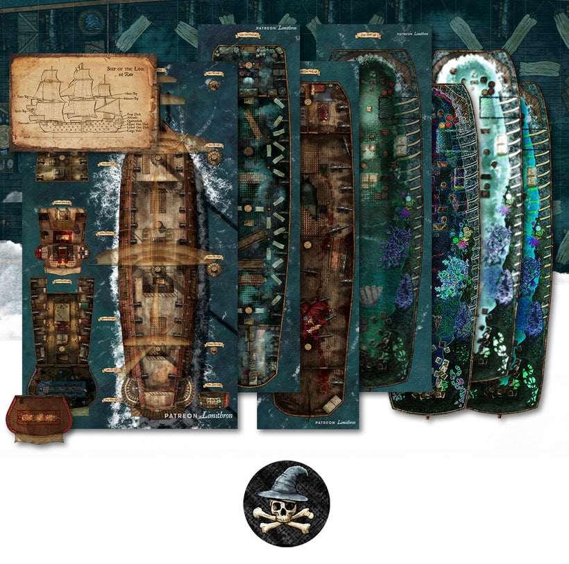 For this venture, Limithron generated a bizarre, ghost-alien version of a massive 56x46 1st-Rate Ship of the Line, as well as tokens, layovers, and a fun naval mini-game!