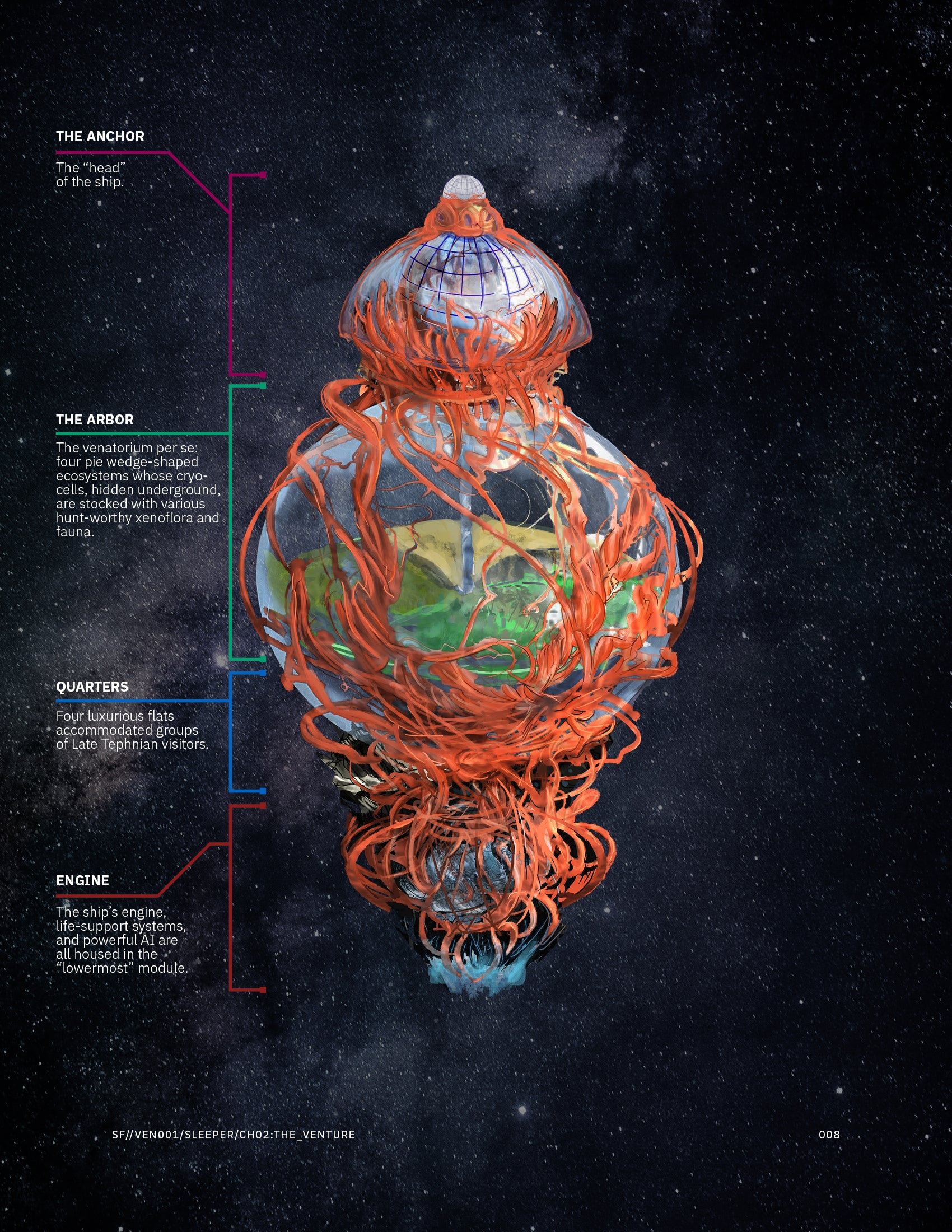 The thing is—because Late Tephnian culture was very messed up—this “pleasure ship” is actually a venatorium, or private hunting grounds, stocked with loads of dangerous xenofauna… and one titular cryo-sleeping noble.