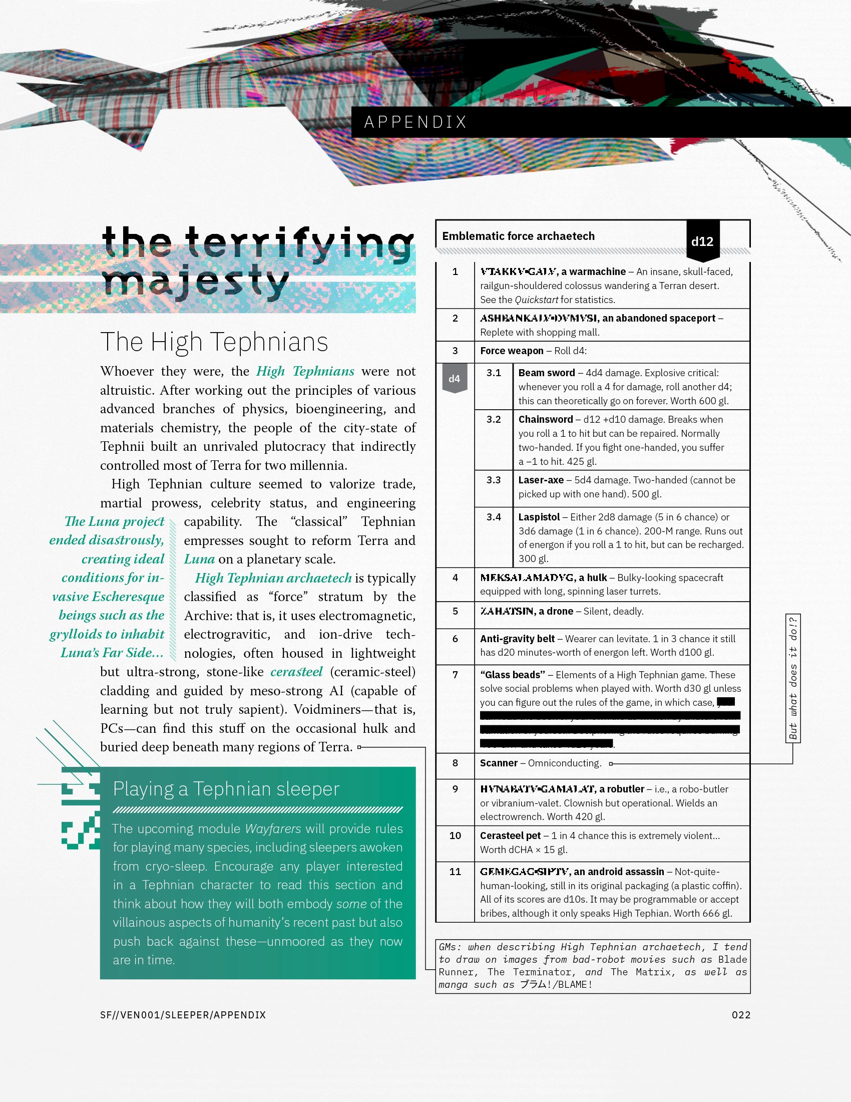 Twenty-five pages of mayhem, including statblocks for xenofauna, lists of oddments and archaetech, and a loaded sky-dungeon to explore…