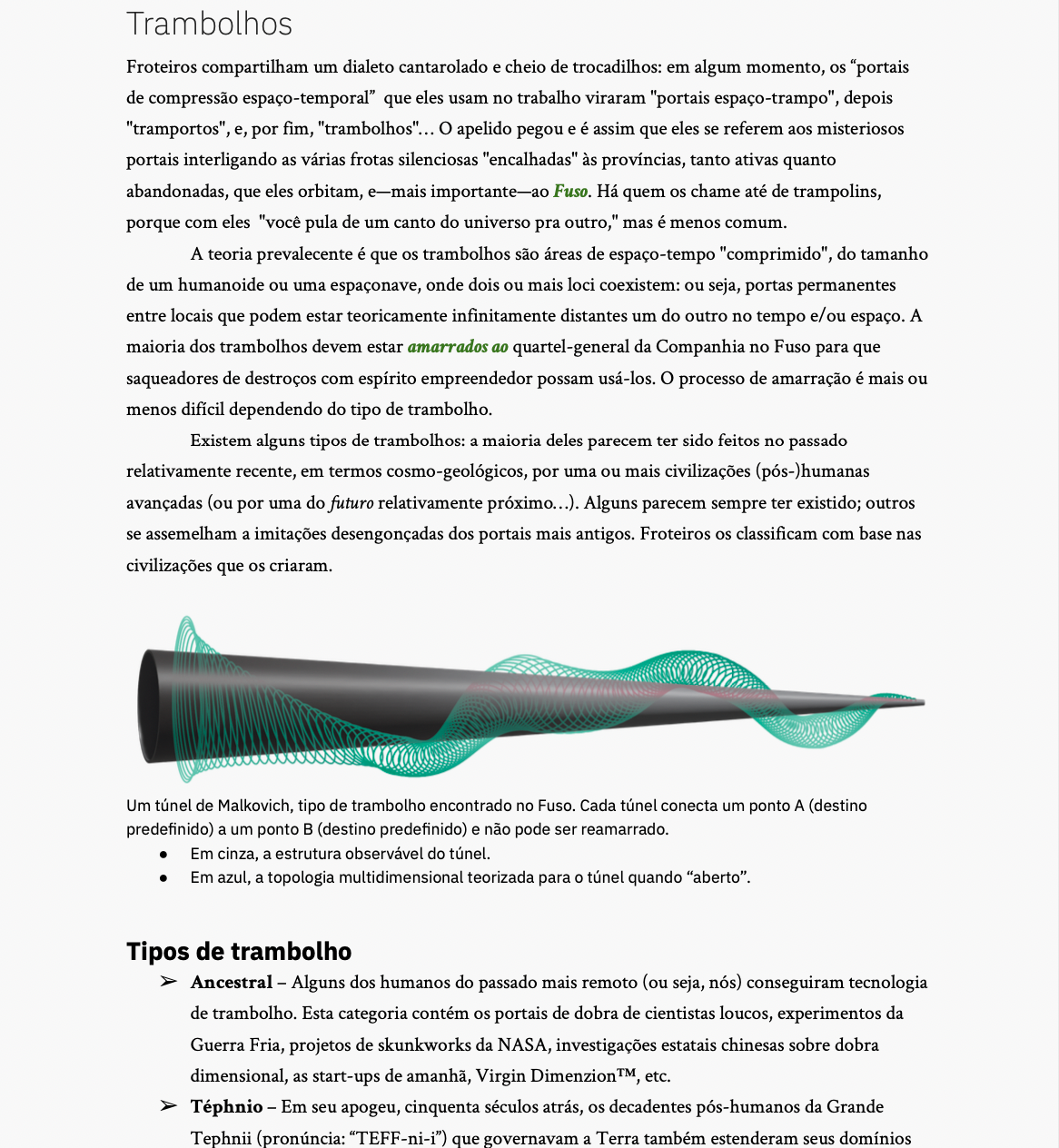 Jogadores assumem os papéis de “froteiros”—exploradores e mineradores siderais trabalhando para a Venerável Companhia de Froteiros, mais conhecida como a Companhia, ou CF (Companhia de Froteiros). O lar deles, a estação espacial apelidada de Fuso—imagine uma lesma marinha de pedra preta ondulada com quilômetros de altura—é um mistério para os próprios habitantes. Ainda por cima, o lugar é repleto de portais espaço-temporais chamados trambolhos, muitos dos quais já estão amarrados a mundos habitáveis…