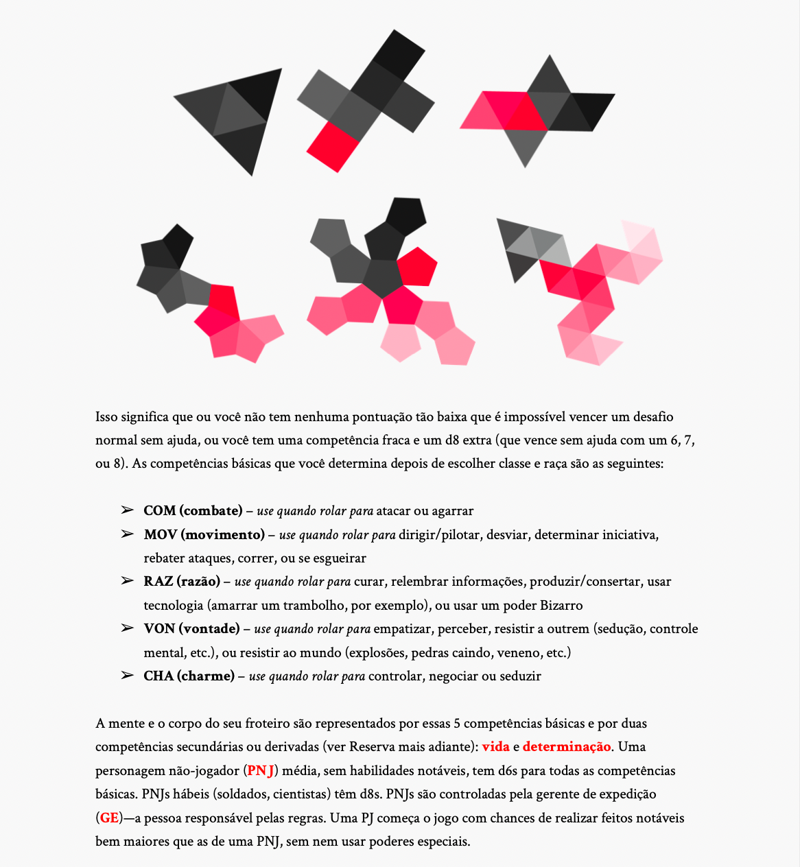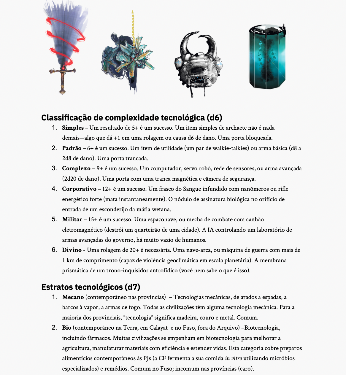 Este Quickstart contém mais de setenta páginas de regras, aliens, cenários e tabelas aleatórias, além de um documento separado com oito Personagens Prontas—todas de classes e espécies diferentes.