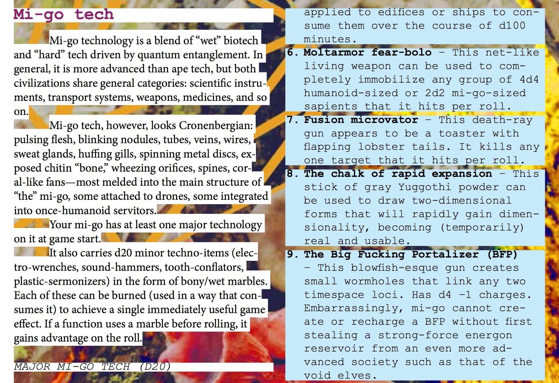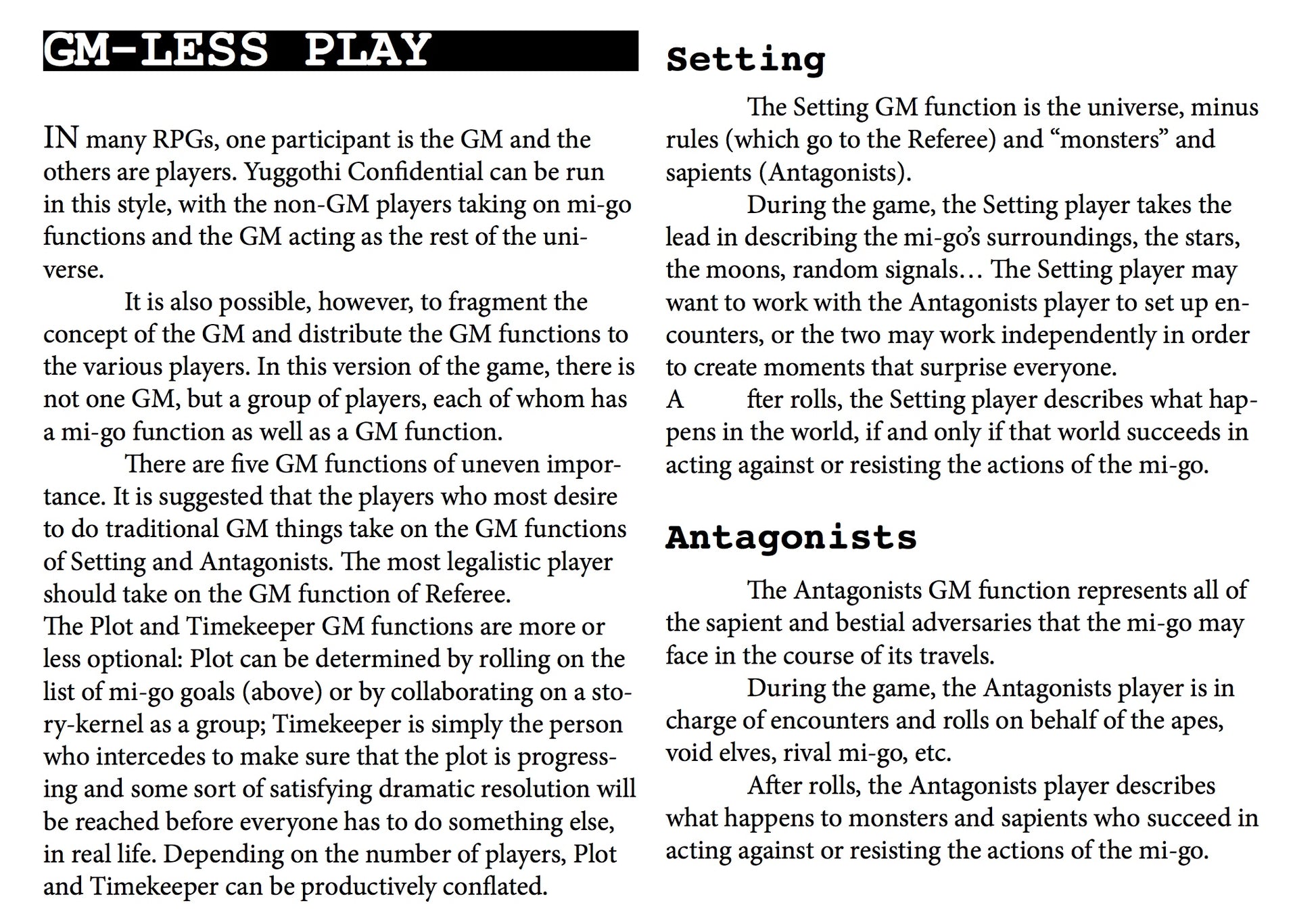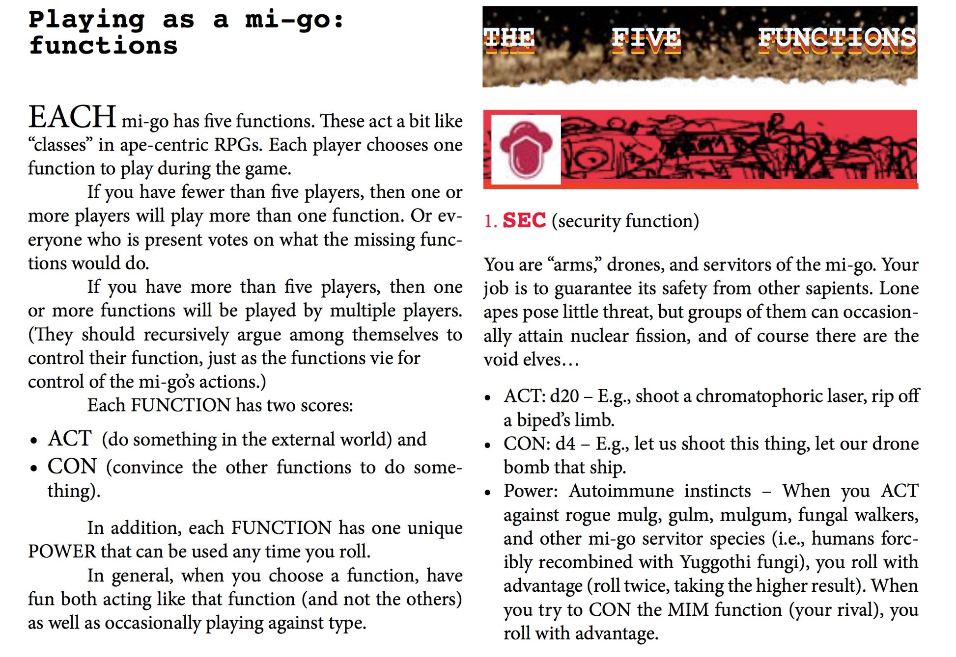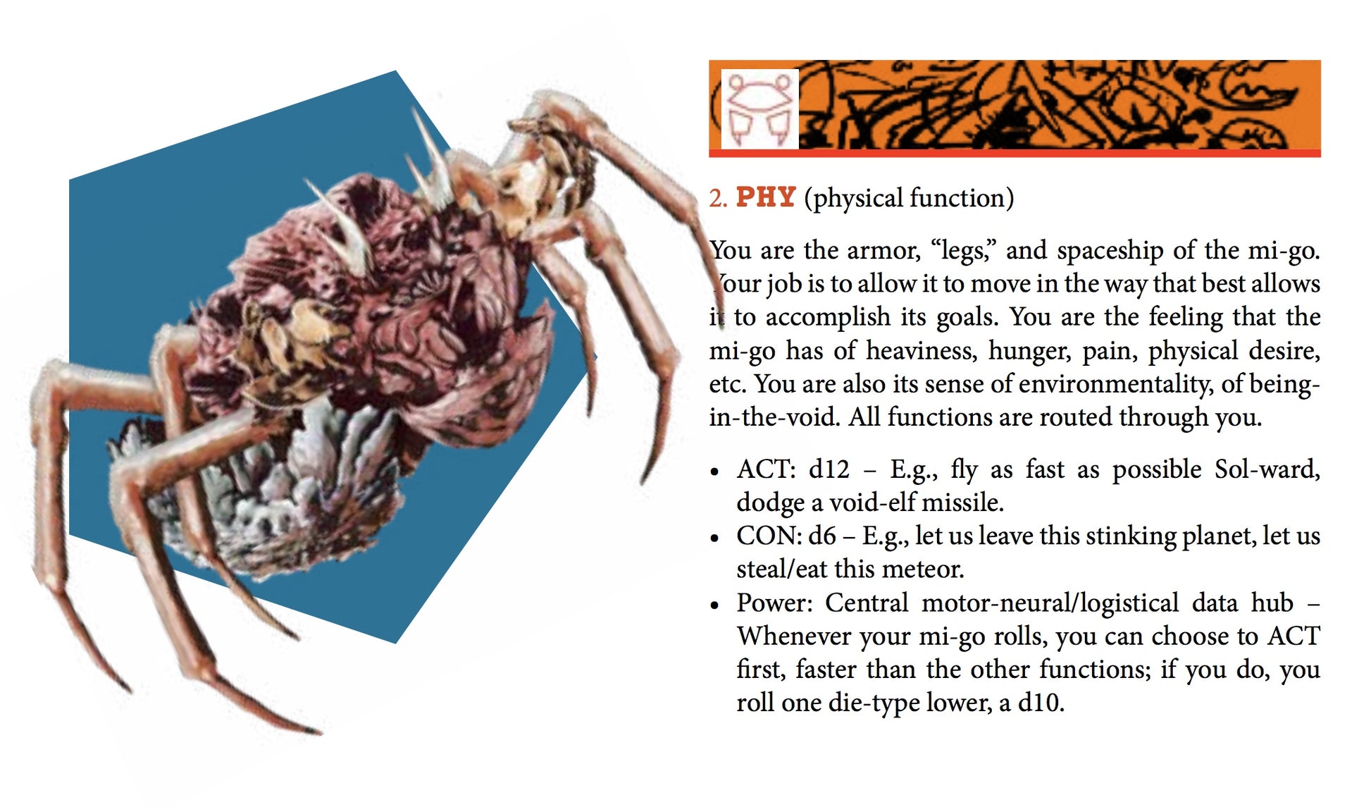 In this game, each player controls one function of the mi-go’s totality. The functions work together toward a common goal, but each should fight for her own priorities and act in her own distinct style. Functions are encouraged to disagree: the rules provide a simple mechanism for resolving disagreement.